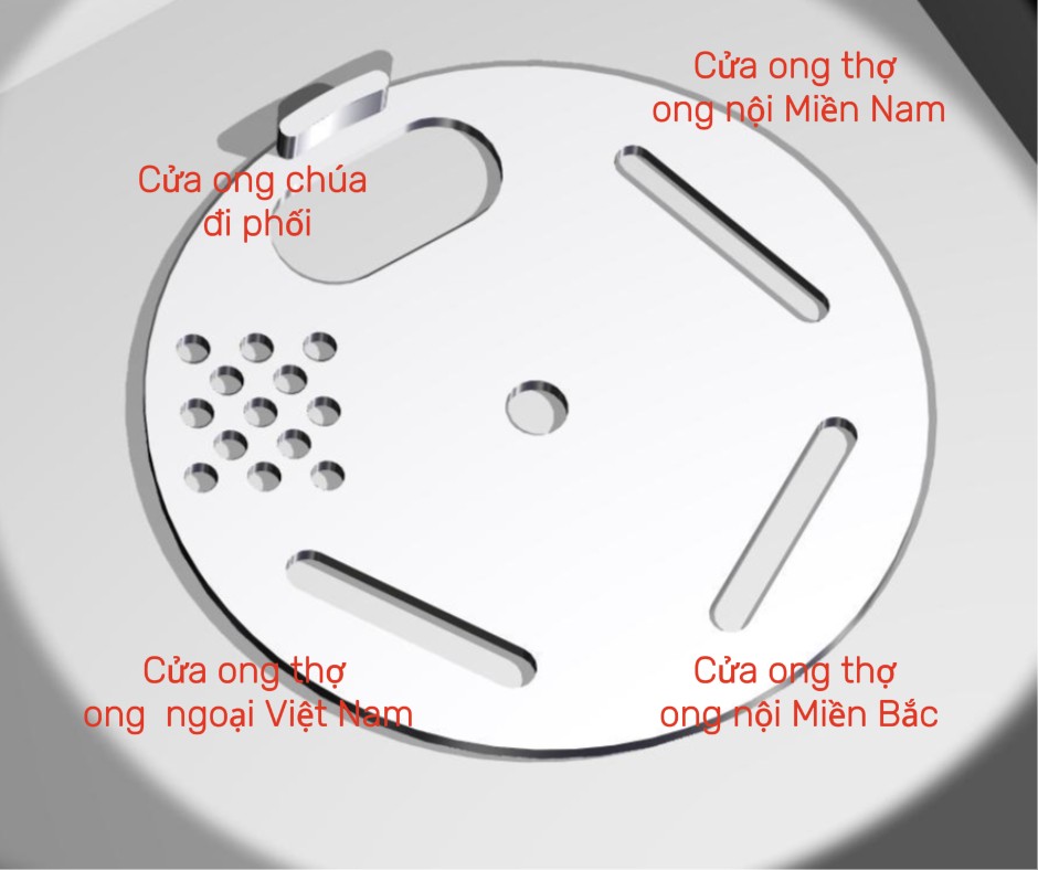 Công dụng làm cửa thùng phối ong chúa. Có 4 chế độ: mở cửa, đóng cửa, khóa chúa ong nội nam bắc, khóa chúa ong ngoại Việt Nam.